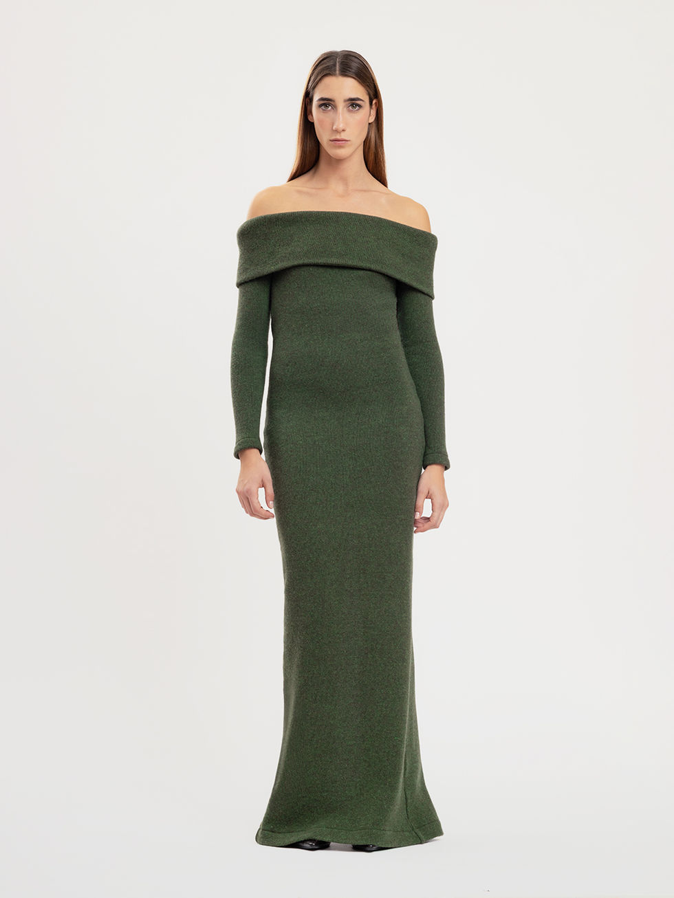 Abito lungo in maglia di lana, con linea aderente e scollo off-shoulder che valorizza la figura. Lo spacco posteriore dona movimento e comfort alla camminata, mantenendo un’eleganza moderna e sofisticata. Per chi cerca uno stile raffinato anche nei look invernali.