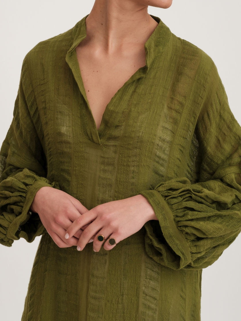 Abito donna in cotone dalla texture naturale e leggermente materica. Il modello presenta un collo alla coreana essenziale, che conferisce al capo un’eleganza contemporanea e pulita. Le maniche ampie, arricchite da una ripresa prima del gomito, creano volume controllato e movimento sofisticato. Il fondo con angoli smussati ammorbidisce la linea del capo, mentre la vestibilità a trapezio scivola sul corpo con naturalezza, valorizzando la figura senza costringerla. Un capo raffinato e versatile, perfetto per chi cerca comfort e stile in un unico modello.