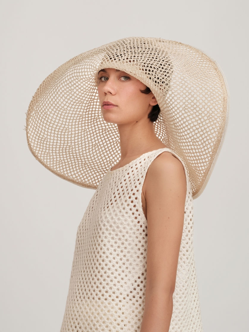 Canotta dalla linea a trapezio realizzata in corda di cotone, crea un raffinato gioco di trasparenze. Il design essenziale valorizza la costruzione del tessuto, protagonista del capo. La vestibilità svasata scivola sul corpo con leggerezza, garantendo comfort e movimento, mentre la linea pulita conferisce un’eleganza contemporanea e versatile. Un capo delicato ma deciso, perfetto per look estivi sofisticati o per essere stratificato con naturalezza.