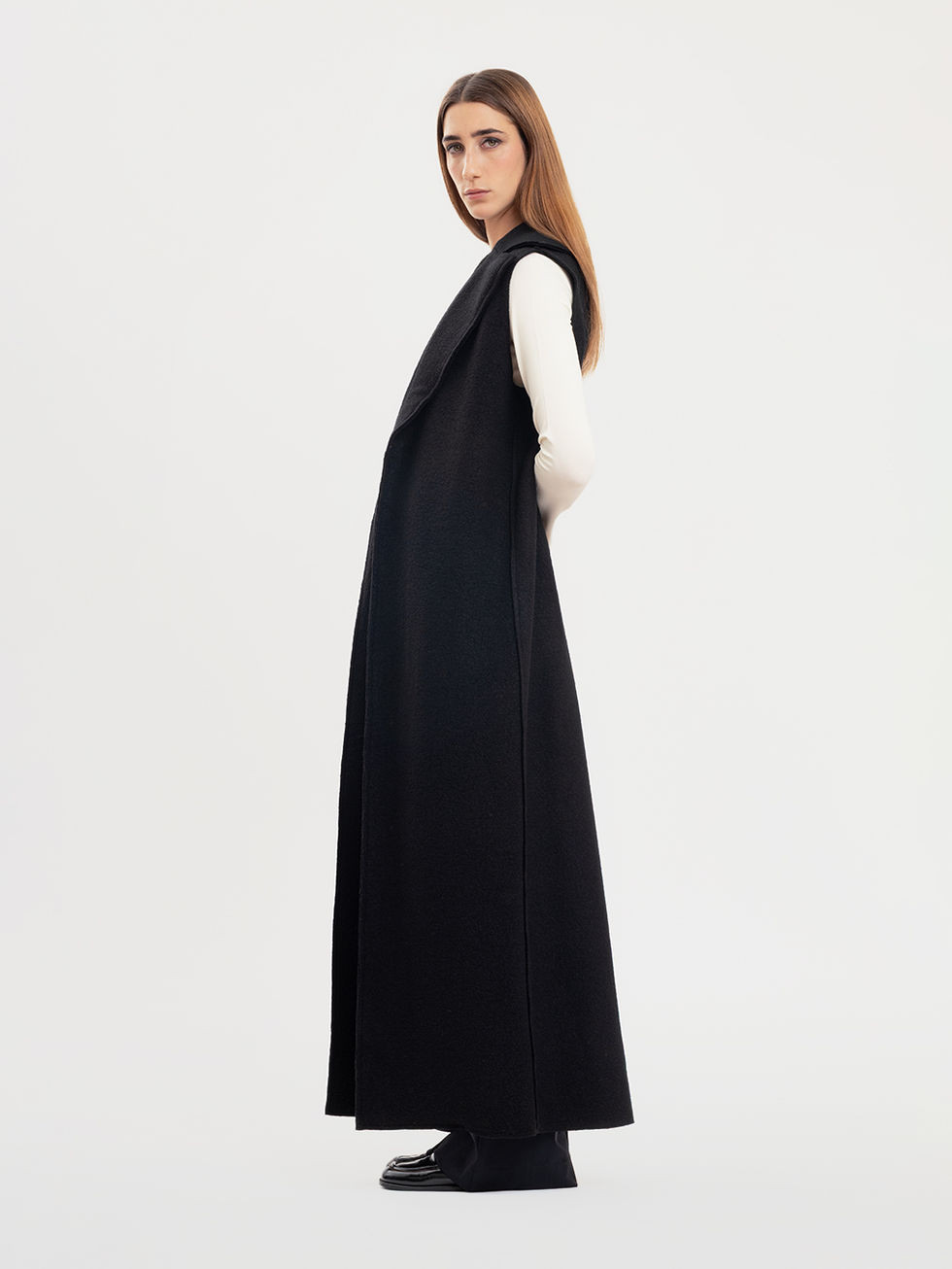 Cappotto gilet lungo in lana cotta, dal taglio essenziale e avvolgente. Il design smanicato lo rende versatile per sovrapposizioni, mentre il rever ampio regala un tocco sartoriale. Perfetto da portare aperto o con cintura in vita, ideale per aggiungere calore e stile ai look di stagione.