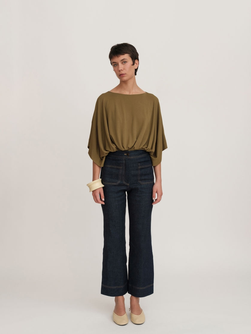 Maglia donna realizzata in morbida viscosa, dal tocco fluido e confortevole sulla pelle. Il modello presenta un raffinato collo a barchetta che valorizza delicatamente la linea delle spalle, abbinato ad ampie maniche a tre quarti che donano movimento e leggerezza al capo. La costruzione è arricciata in vita per creare un effetto morbido e femminile, enfatizzato da una cinta alta che definisce la silhouette e slancia la figura. Un capo versatile e sofisticato, ideale sia per contesti quotidiani che per occasioni più curate.