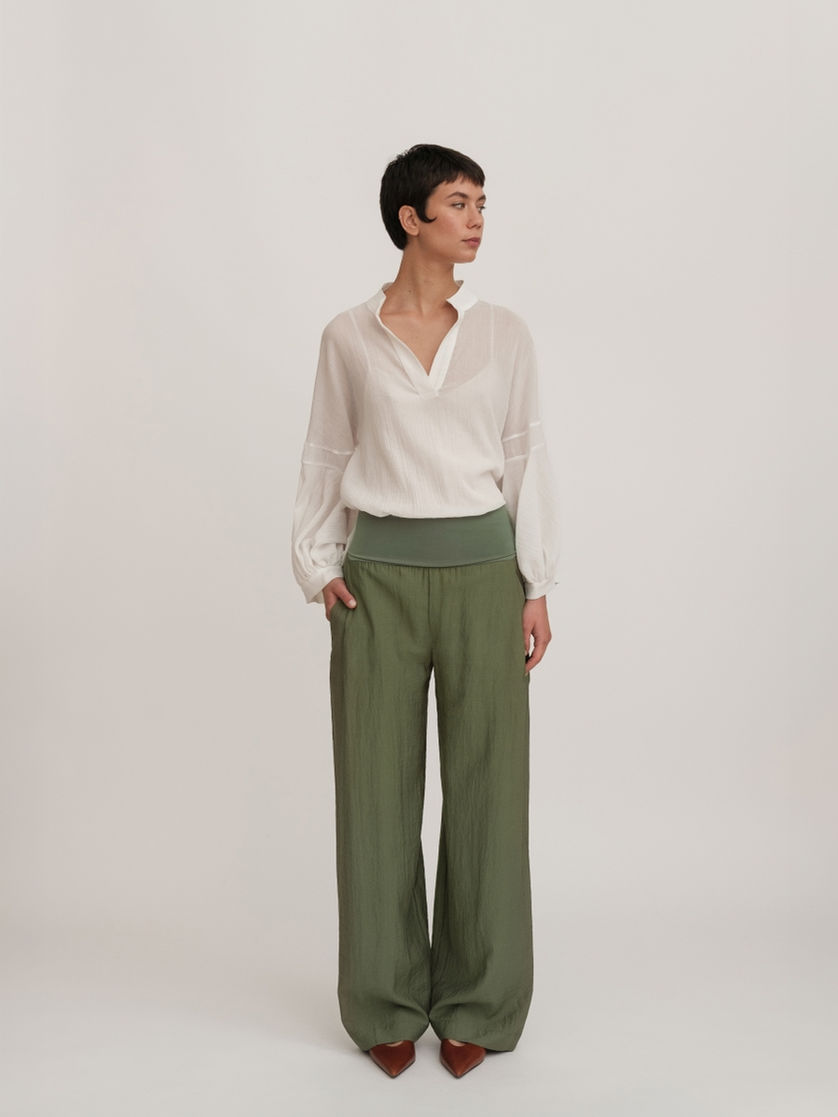 Pantalone Aladin in tessuto fluido, caratterizzato da una cinta/bustino in vita che si può indossare in più modalità. La parte superiore è fasciante, mentre la gamba regular crea un perfetto equilibrio tra comfort e femminilità. Modello raffinato, versatile e ideale sia per look sofisticati che casual.