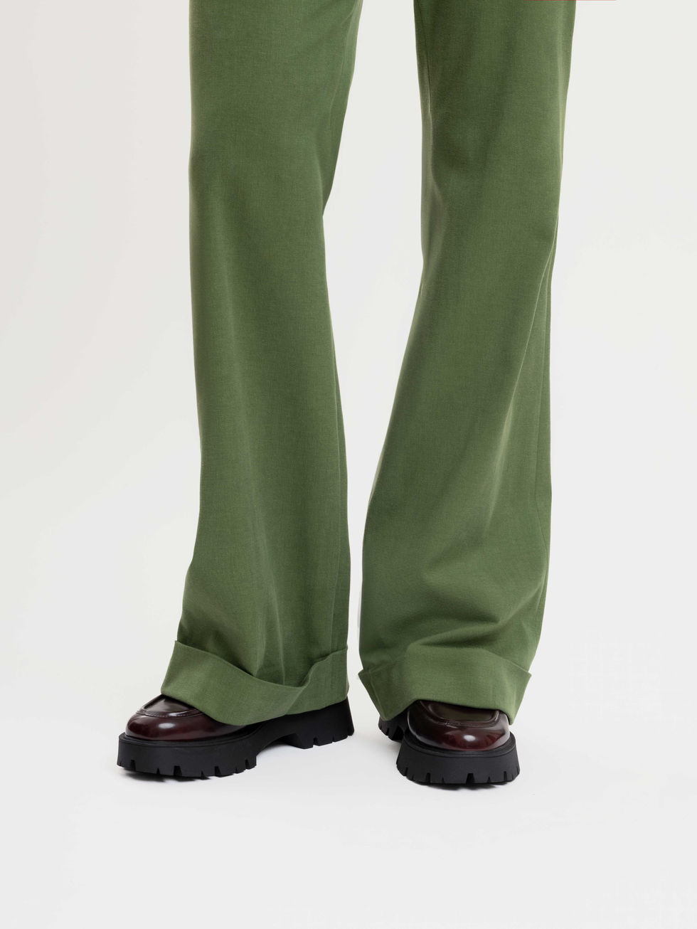 Pantaloni flared a vita alta: taglio sartoriale e gamba più ampia sul fondo, per una silhouette slanciata. Senza cinturino, spacchetto sul retro per un comfort unico. Tessuti morbidi e comfort donano una vestibilità versatile per tutta la giornata. Perfetto per look casual e per occasioni formali.