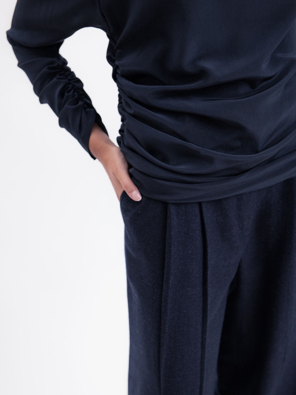 Pantaloni sartoriali spigato blu, realizzati in un prezioso mix di lana e cashmere. Eleganti e confortevoli, valorizzano la silhouette grazie al taglio impeccabile, offrendo stile e avvolgente morbidezza ogni giorno. Un capo senza tempo, perfetto per look raffinati e versatili.