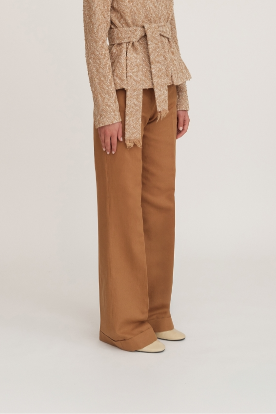 Pantalone sartoriale dal taglio maschile, realizzato in cotone e lino. Il modello presenta un risvolto sul fondo della gamba, dettaglio che aggiunge carattere e un tocco curato al capo. La vestibilità dritta e pulita valorizza la silhouette con equilibrio, rendendo questo pantalone versatile e adatto sia a look formali sia a outfit più contemporanei.