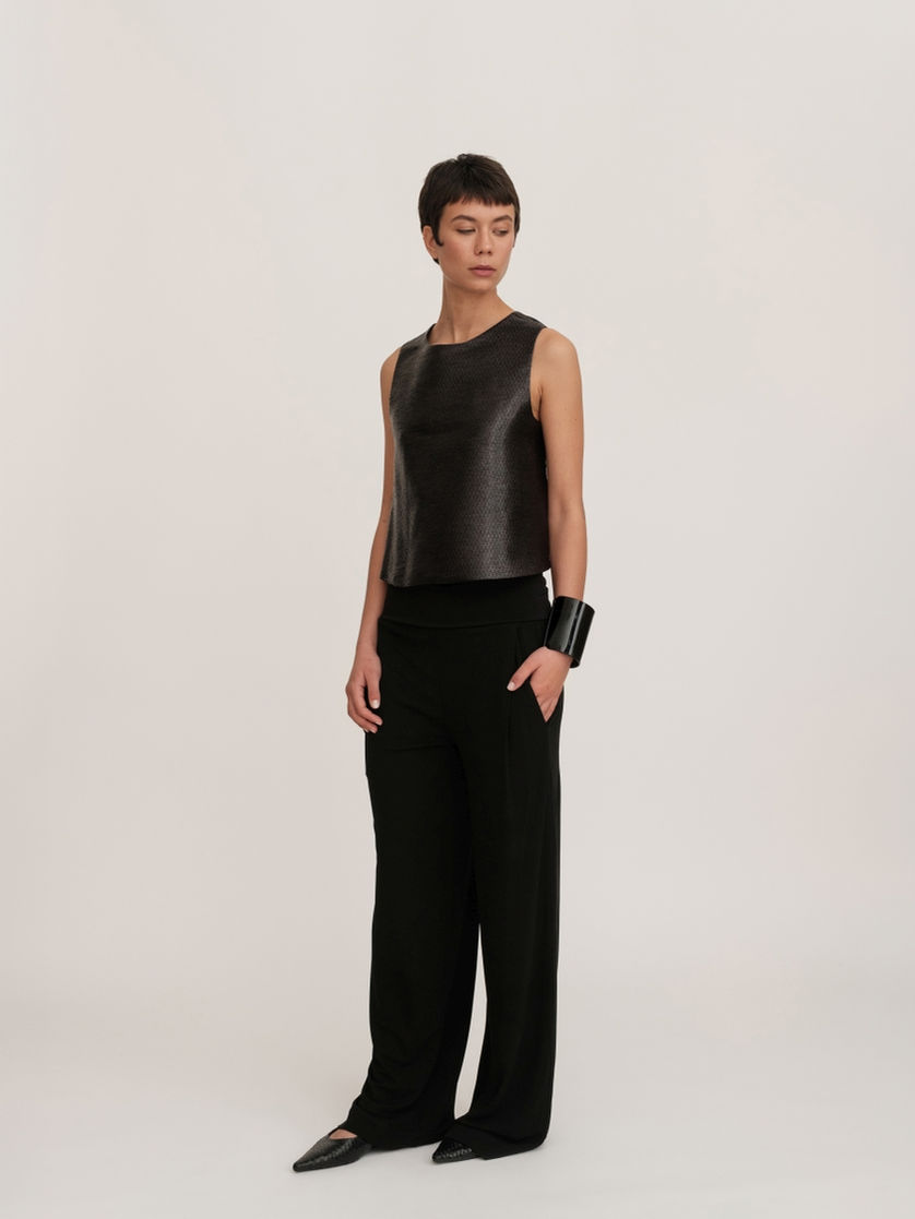 Elegante gilet realizzato in rafia di seta nera, caratterizzato da una texture materica che conferisce al capo una struttura definita e un aspetto ricercato. Il design presenta uno scollo tondo essenziale, che ne esalta la pulizia formale. L’allacciatura sul retro diventa elemento distintivo, lasciando intravedere la schiena nuda e aggiungendo un tocco sensuale e sofisticato. La linea leggermente svasata accompagna la figura con equilibrio, mantenendo una silhouette armoniosa. Un capo contemporaneo e di forte personalità, in cui la matericità del tessuto incontra un’eleganza discreta ma decisa. Può essere portato solo o per renderlo meno formale con una t-shirt o sopra ad una camicia dal taglio maschile.